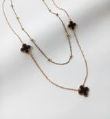 Elevate your everyday look with this elegant layered clover necklace. Crafted with a gold-tone chain and accented by sleek black clover motifs, this piece adds a touch of modern luxury to any outfit. Perfect for wearing solo or layering, it transitions effortlessly from day to night for a timeless, polished finish.